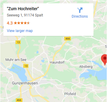 KONTAKT Cafe-Restaurant Zum Hochreiter Familie Amende Seeweg 1 91174 Spalt - Enderndorf am See +49 9175 9749 gasthaus@zumhochreiter.de